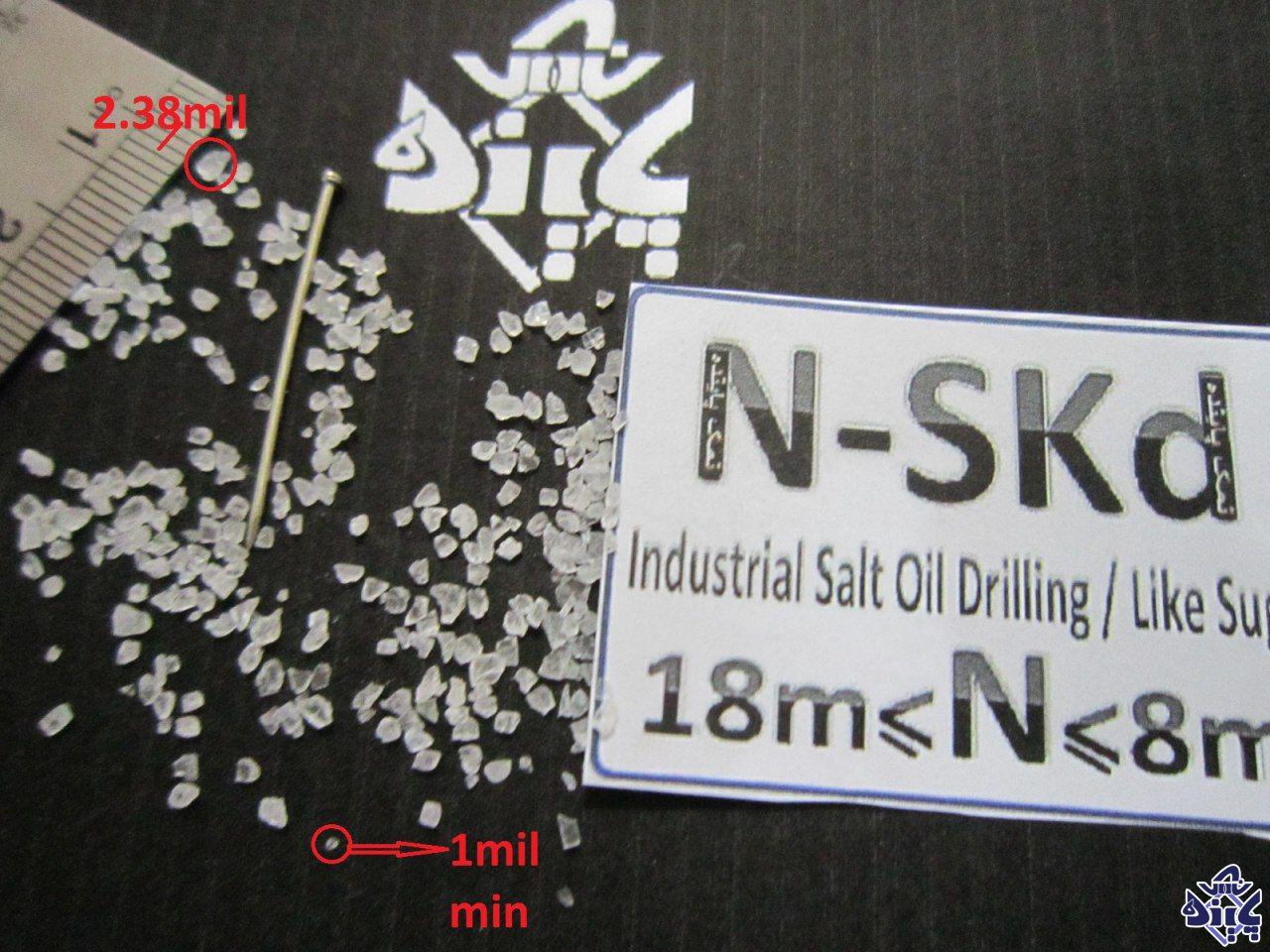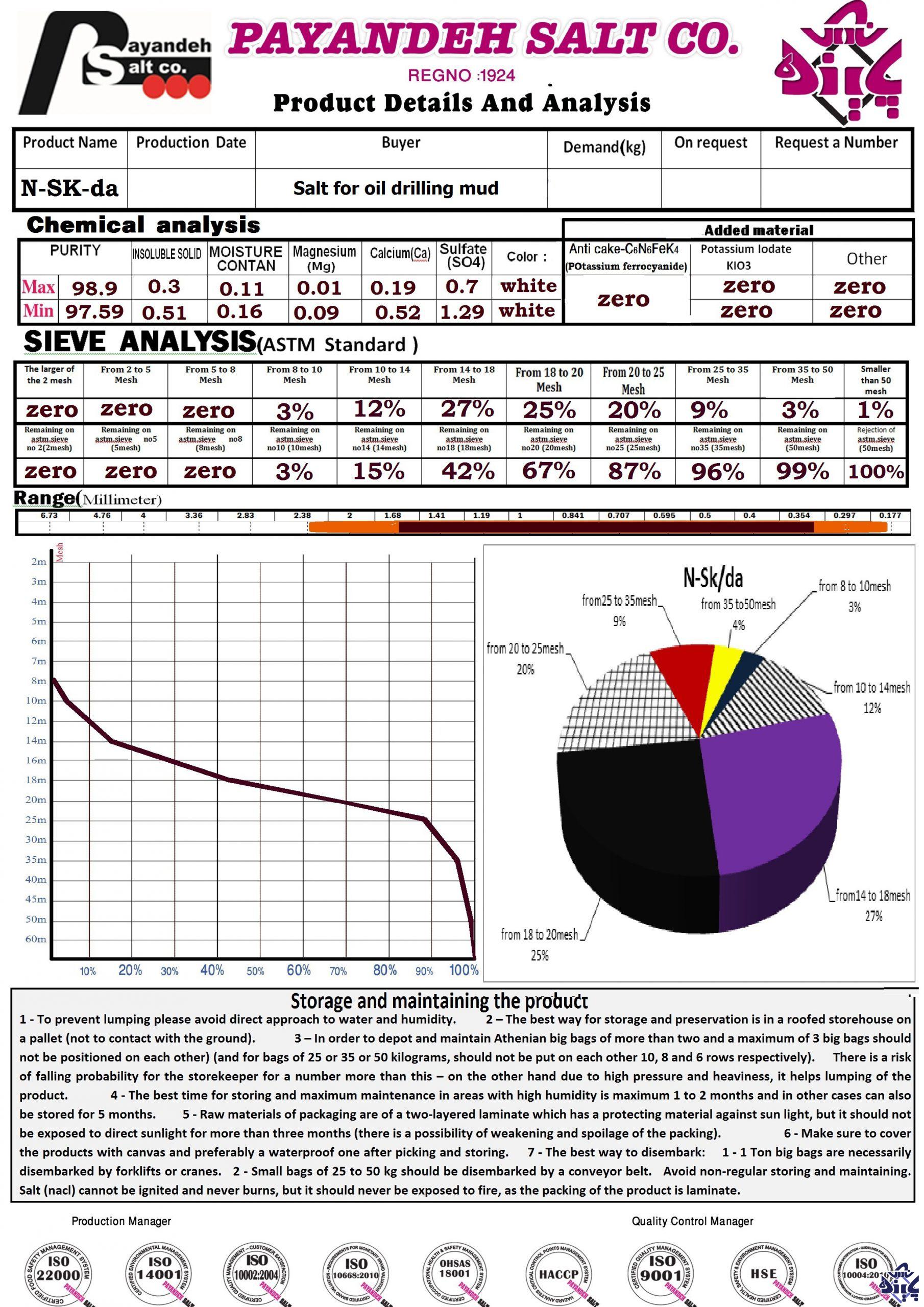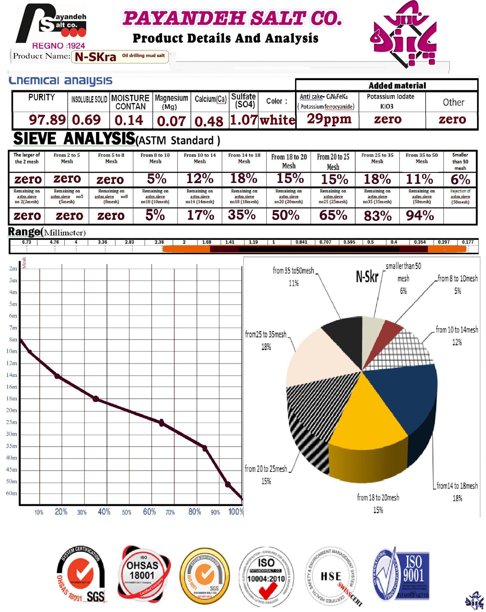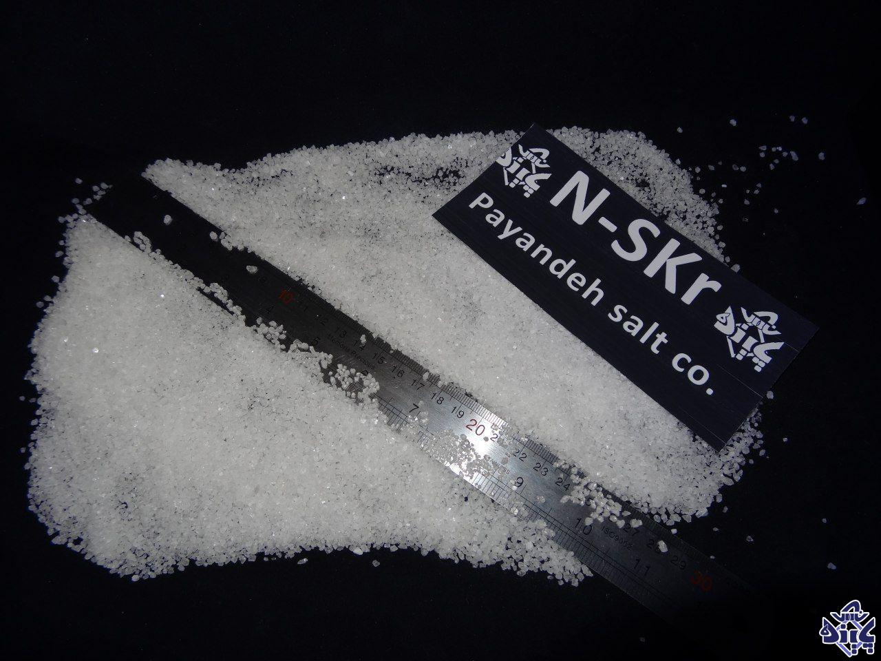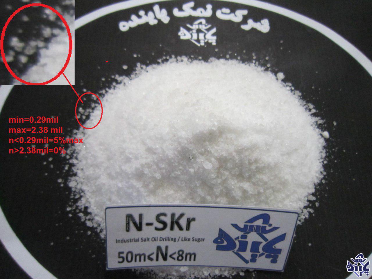 N-SKr این نوع نمک از کیفیت میانگین  و وسط بین دو سایز بالا برخوردار میباشد و معمولا دراکثر کارخانجات به شرکت نفت داده میشود  هرچند سایز نرمه یعنی بین 40تا 50مش آن بهتراست از 5درصد تجاوز نکند و اکثرا متسفانه تا 15درصد نیز مشاهده شده که به شدت به محصول آسیب رسانده و موجب پایین آمدن کیفیت محصول و کلوخه شدن آن میباشد  ولی درشرکت نمک پاینده درتمام شرایط و به استناد ازمایشات و گزارشات مشتریان  هرگز اجازه داده نمیشود که میزان نرمه کمتر از 45مش و آن هم حداکثر 4درصد تجاوز کند برابر پیشنهاد واحد فنی نمک پاینده   بهتراست الزاما این محصول را بعلت وجود دانه های بین 40تا50مش حتما با اضافه کردن آنتی کیک (فروسیانید پتاسیم) ضد کلوخه استفاده کنیم